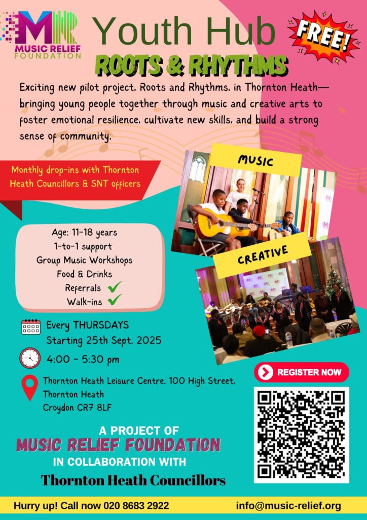 On Thursday 25th September 2025, the new after-school programme called ‘Roots and Rhythms‘, which I’ve been working on alongside local charity Music Relief Foundation, will launch at Thornton Heath Leisure Centre: creating safe spaces, music and wellbeing opportunities for young people locally, free of charge.